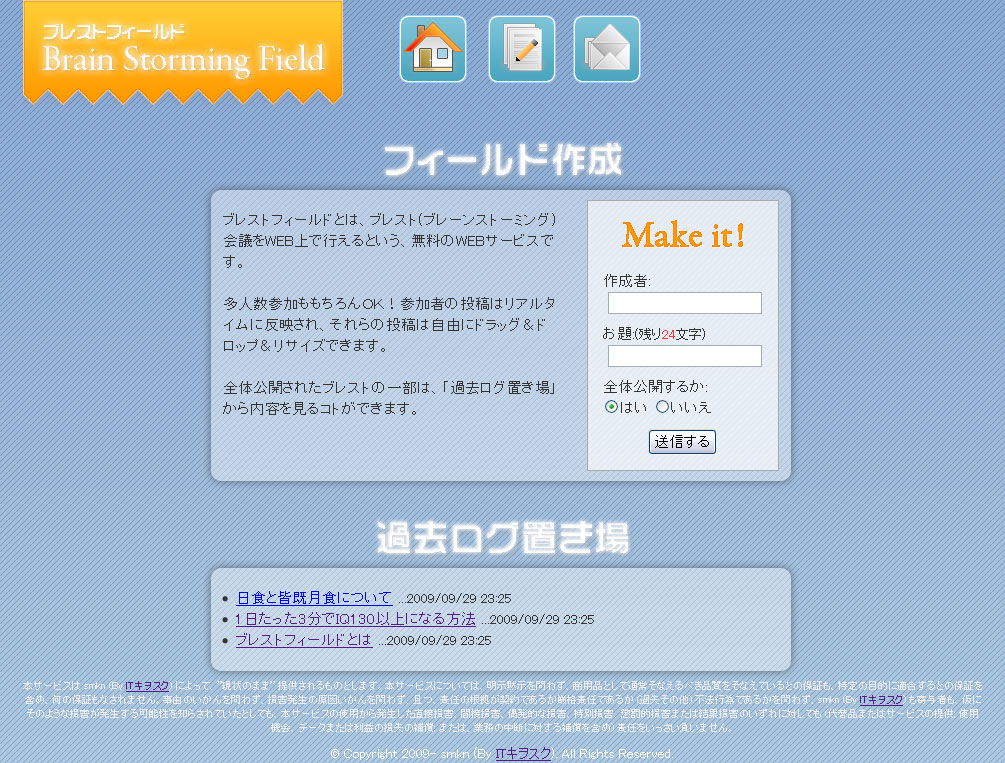 今回のエントリーは、smkn渾身のオンラインブレーンストーミング用のWEBサービス「ブレストフィールド」のご紹介です!