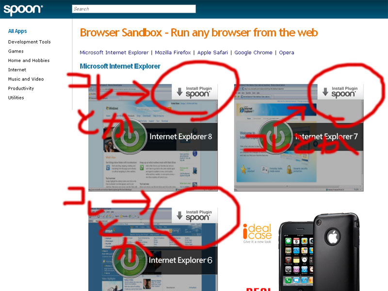 この「Spoon Browser Sandbox」、残念ながらOperaとGoogle Chromeでブラウジングした場合、起動用exeファイルをダウンロードしたり、各種ブラウザを呼び出すコトができません。。。