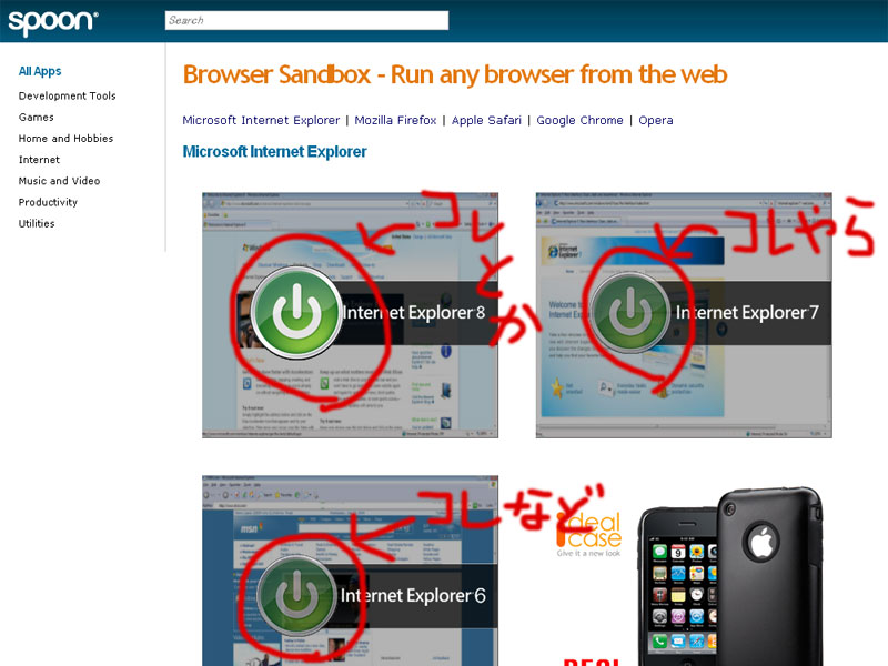 exeファイルが鍵だとするならば、各ブラウザへの扉こそ、先ほどブックマークした「Browser Sandbox - Run any browser from the web」のページそのもの。