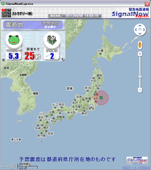 緊急地震速報を受信すると、テレビ等でも速報表示時に流れるアラート音と同時に、自動的にこのような画面がポップアップされ、google map上に震源地がカエルのアイコンで表示されます。