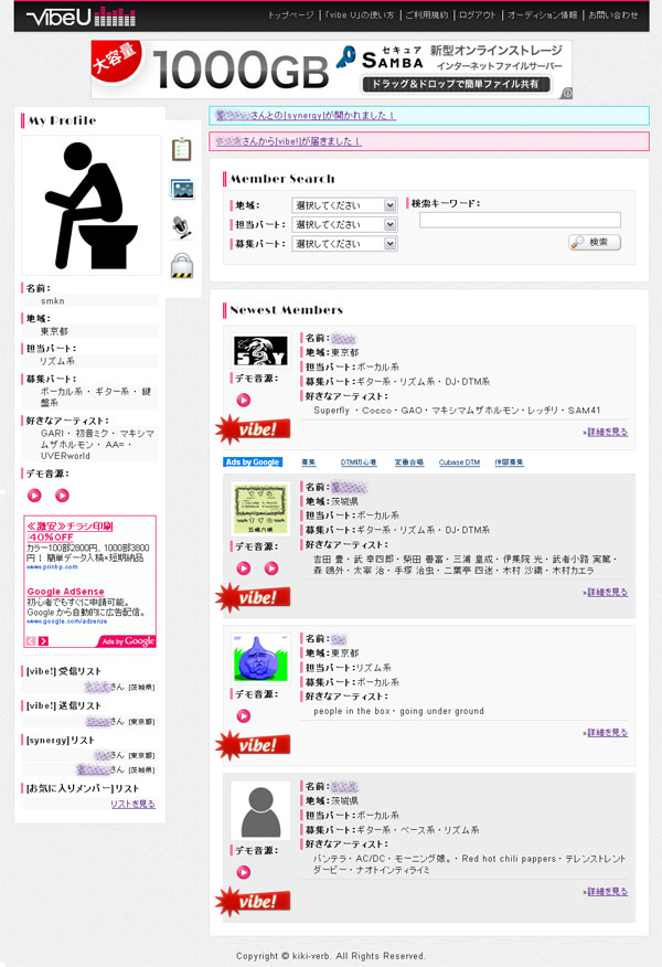 基本機能としては、メンバー検索はもちろん、プロフィール閲覧やデモ音源の試聴をはじめ、気になったメンバーに対して「私はあなたに興味を持ちました」という意思表示をワンクリックで送信する「vibe!」ボタンや、メンバー同士がお互いに「vibe!」ボタンを押した場合に本人達にだけ開かれるtwitter型コミュニケーションツール「synergy」ページなどを装備しています。