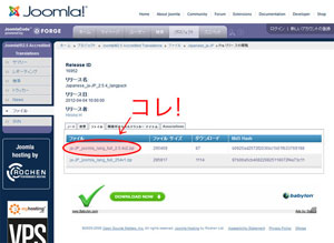 Joomla!日本語化パッケージ配布ページにアクセスし、[ノート][変更][ファイル]などのタブの[ファイル]をクリック、「ja-JP_joomla_lang_full_2.5.4v2.zip」をクリックすると、自動的に日本語パッケージがダウンロードされます。