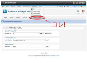 管理画面上部のメニュー部「Extensions」にマウスを合わせ、ドロップダウンメニューの最下部「Langage Manager」をクリック。