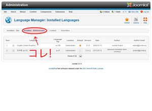で、今のはサイト側の設定なので、同じように管理画面側の設定もするために、「Language Manager」の見出しの下にあるメニューの中から「Installed - Administrator」をクリックしましょ。