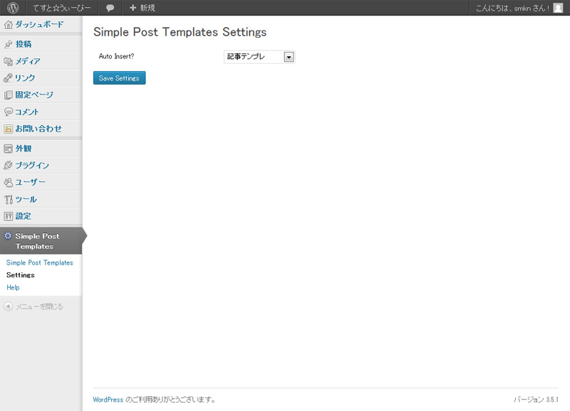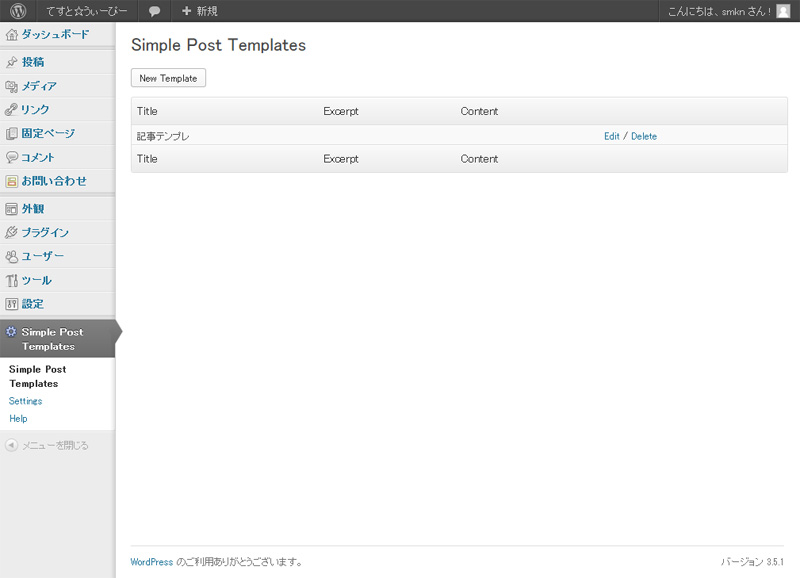 そんな場合は、左部ナビの「Simple Post Templates」をマウスオーバーして「Settings」を押してみなはれ。