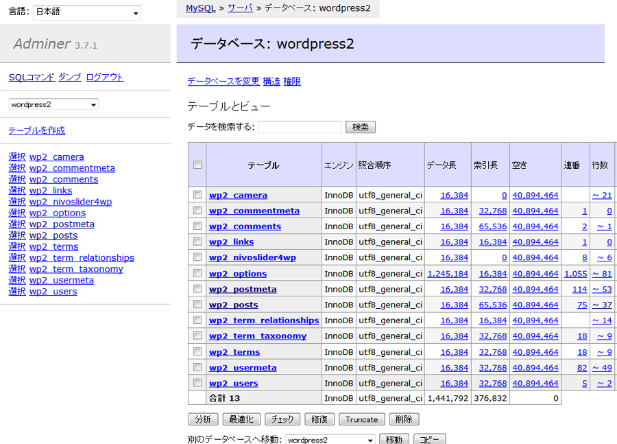 しかも容量も挙動も軽くって、もはやphpMyAdminの「代わり」じゃなく、本命として使えるレベル。