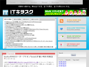 ファーストビューに好きなRSSを読み込んだタブ型リーダーと、自身のRSSや連絡先やアマゾンほしい物リストのリンク先をデカデカ配置したデザインですね。