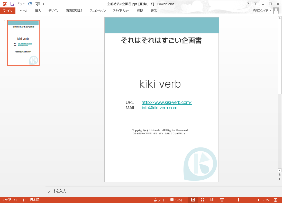 左記は今回の件で作ってた提案書をちょこっと手直ししたものです。ご覧の通り、Windows10のOffice2013ちゃんですが、他のバージョンでも同様の症状には効果があるかと思いますので、しばしお付き合いを。