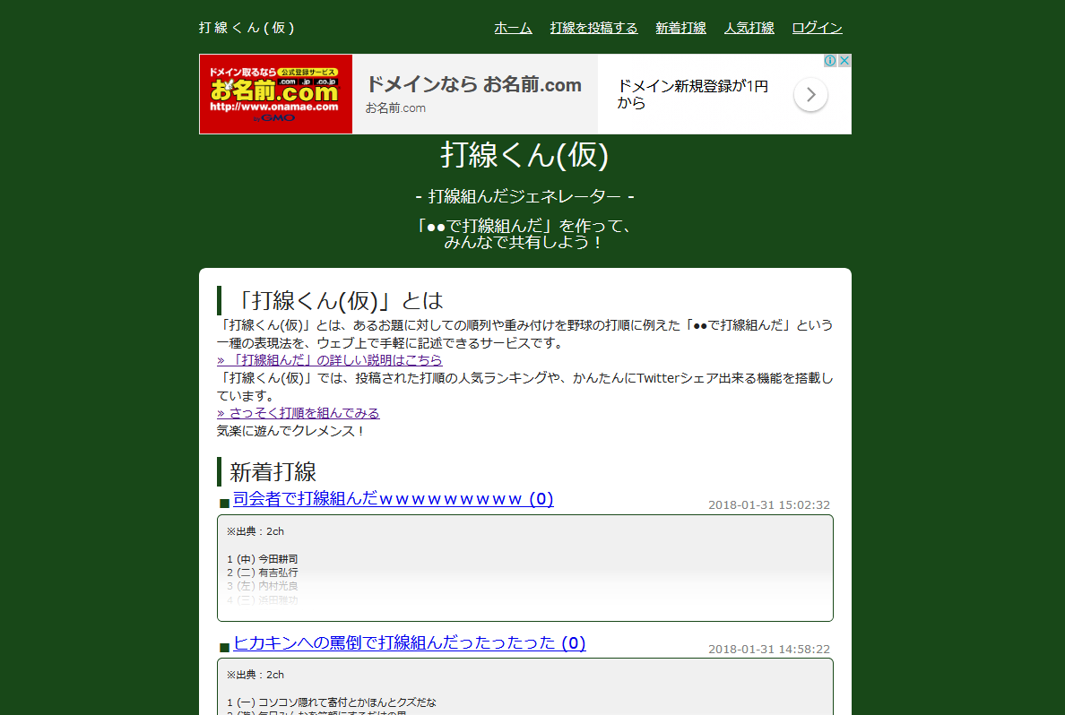 んで、正月にちょっと勉強でもしよかっつーコトで手を出したvue.jsが思いの外しんどくて、その反動で軽ーく気楽になんか作りたいって衝動が溢れてしまったので、この「打線組んだ」を題材にしたウェブサービスでも作ろうかと数日ほどイジイジして出来たのが今回ご紹介するサービス。