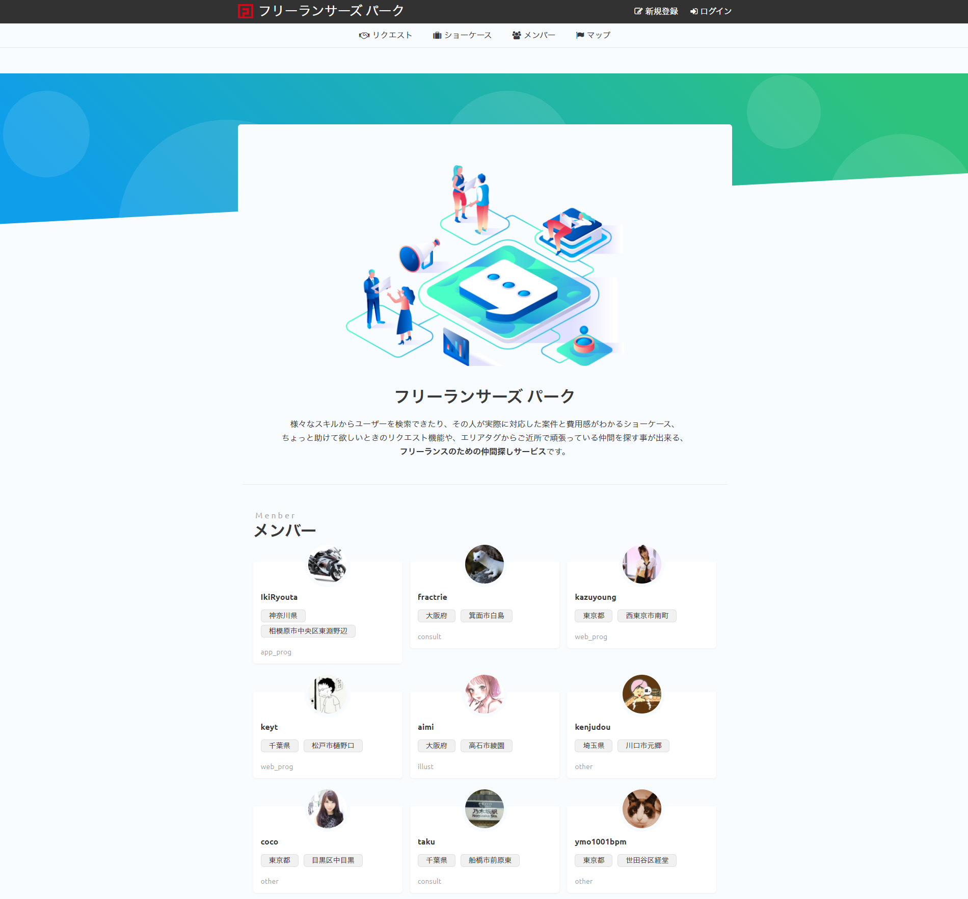 ご存じ無い方も多いと思いますので、改めてこの「フリーランサーズ パーク」は、ご近所で頑張っているフリーランサー同士を結ぶ、仲間探しサービスでございます♪